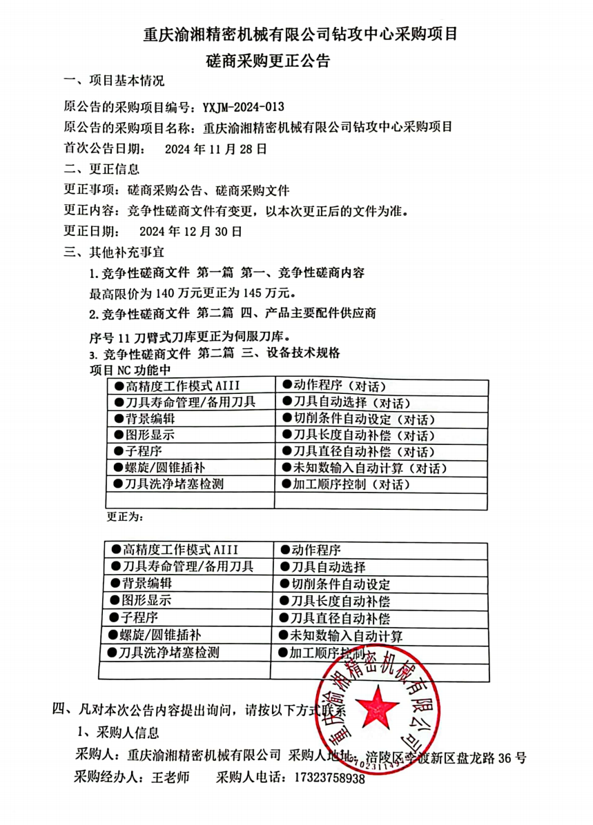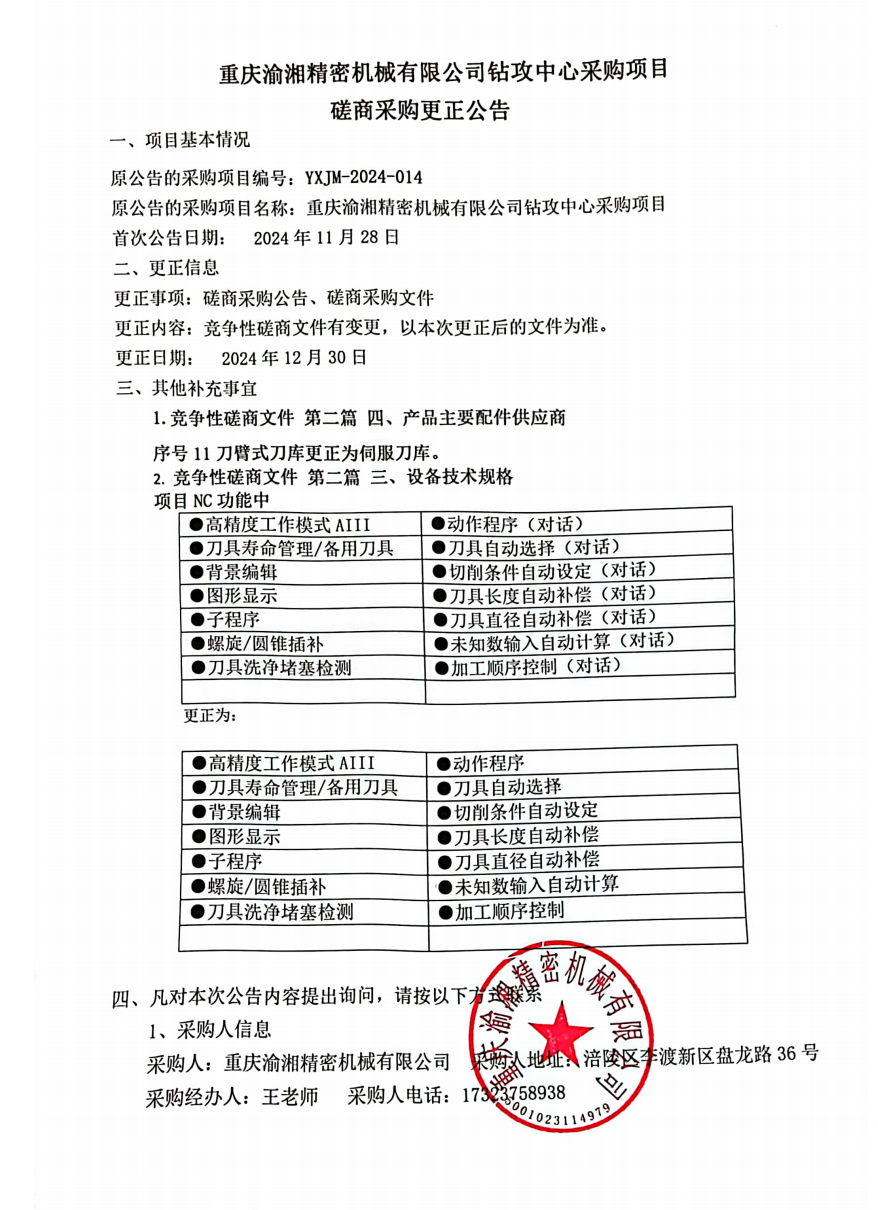 重慶渝湘精密機械有限公司鉆攻中心采購項目磋商采購更正公告