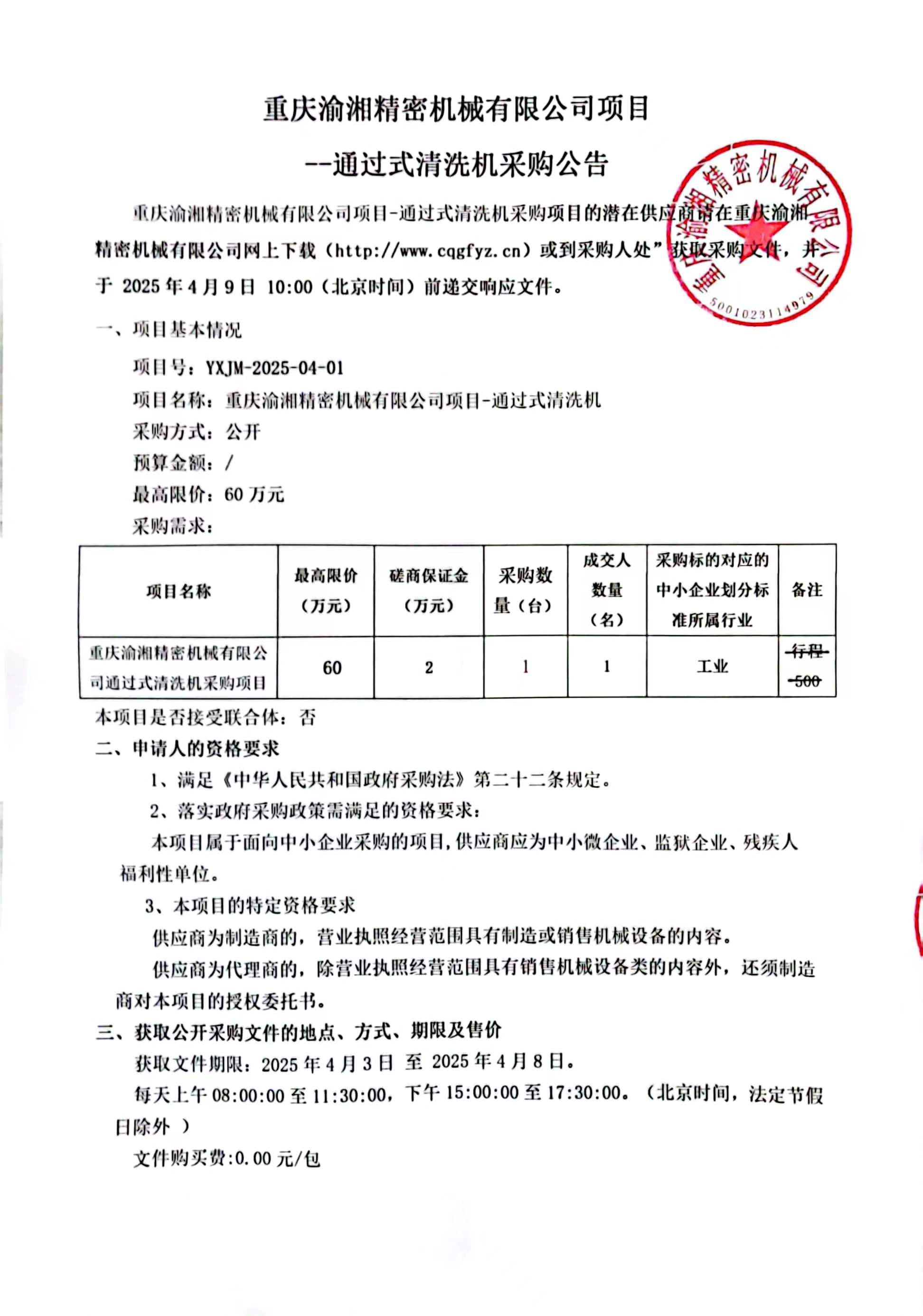 重慶渝湘精密機械有限公司項目--通過式清洗機采購公告
